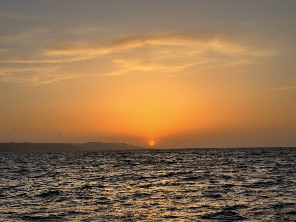 Strax efter solnedgången var vi på väg in i den viken vi valt för nattens ankring, Ghadira Bay på norra sidan på Malta. Viken var lätt att angöra i mörker och fick bra omdömen i Navily utifrån rådande väderförhållanden. Däremot var den inte särskilt mysig. Efter att ha lyckats undvika fiskodlingarna som låg mitt i viken var vi efter ett par försök väl ankrade på en sandfläck.