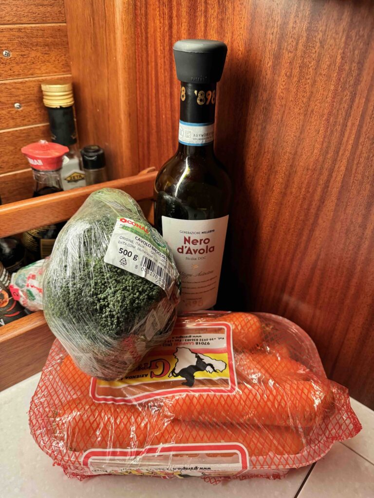 Efter en ovanligt sen middag vid 22-tiden var vi nöjda med att krypa till kojs. För att rädda den öppnade vinflaskan stöttades den upp med morötter och broccoli.