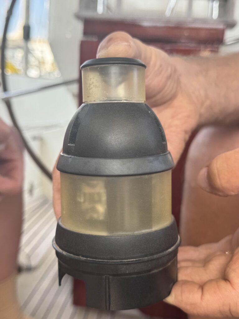 Efter att ha konsulterat vår vän Chat GPT konstaterade vi att lanternan var av fabrikat Aqua Signal serie 32. Denna serie tillverkas inte längre men det går att använda serie 34 av samma märke för att slippa byta bottenplatta i toppen på masten.